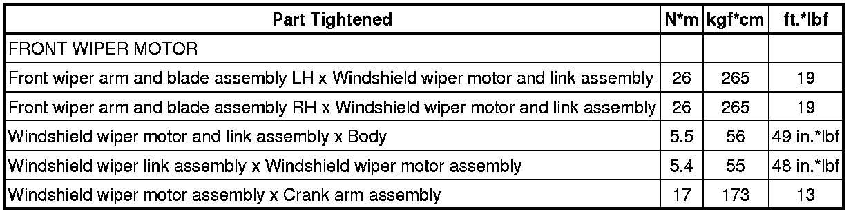 SPECIFICATIONS: WIPER / WASHER: TORQUE SPECIFICATIONS; 2013 MY Corolla [07/2012 -]