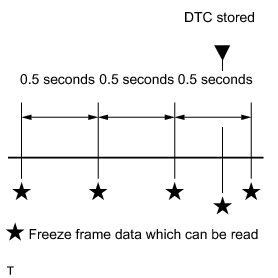 * The ECM records engine conditions in the form of freeze frame data every 0.5 seconds. Using the Techstream, 5 separate sets of freeze frame data can be checked.