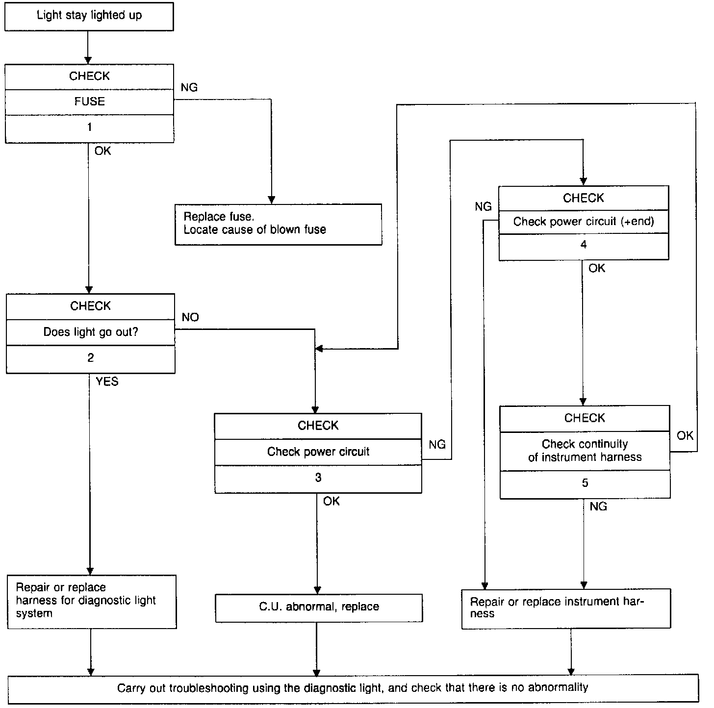 - Lamp stays ON -> abnormality in wiring harness of diagnostic light system -> repair or replace harness