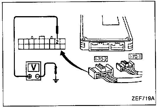1. Remove all harness connectors from the control unit, turn the ignition key switch ON, then measure the voltage the body (-end) and between terminal (2) (+ end) of connector [I-70-2].