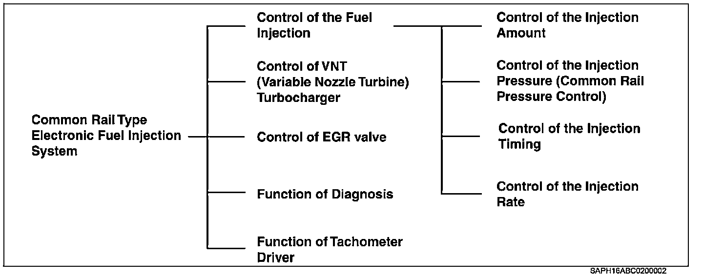 The Common Rail Fuel Injection System has a lot of control functions than the conventional injection pump system. These functions are controlled by the ECU (Electronic Control Unit).