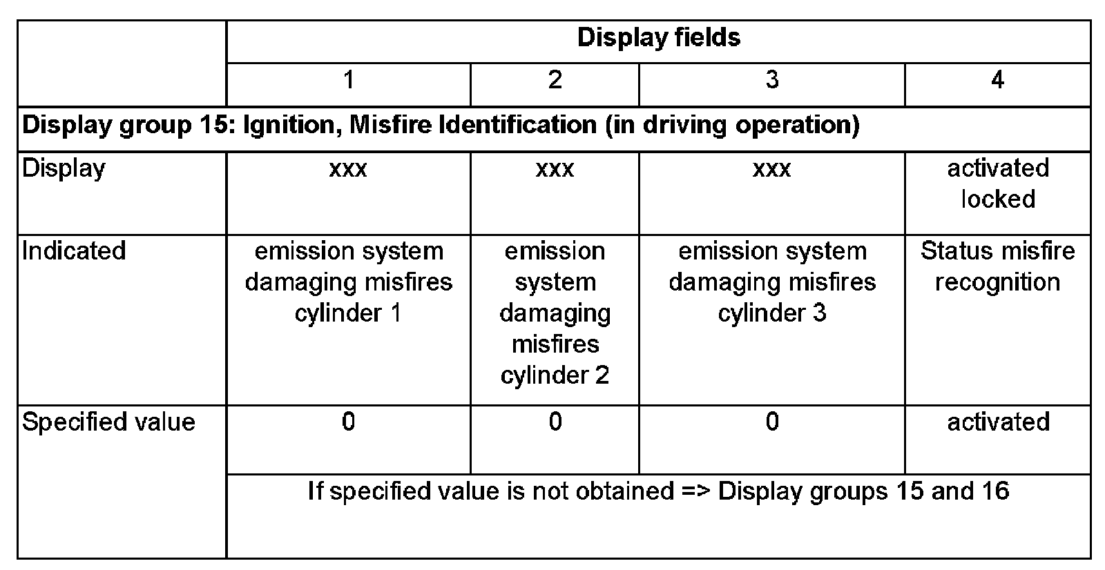 Evaluation of display groups 15 and 16, display fields 1 to 3 - total number of emissions -damaging misfires cyl. 1 through cyl. 6