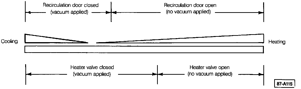 NOTE: The vacuum system supplies engine vacuum, by way of an intake manifold vacuum line, to operate the heating and ventilation control servos. The vacuum system is tested by checking for servo operation and vacuum at different control head settings. The servos are best reached by removing the instrument panel.