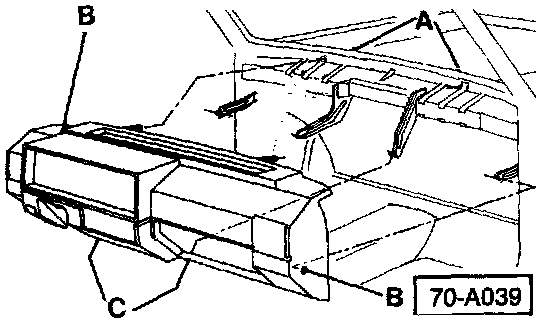 - Disconnect A/C lines at expansion valve (B), cap openings immediately.