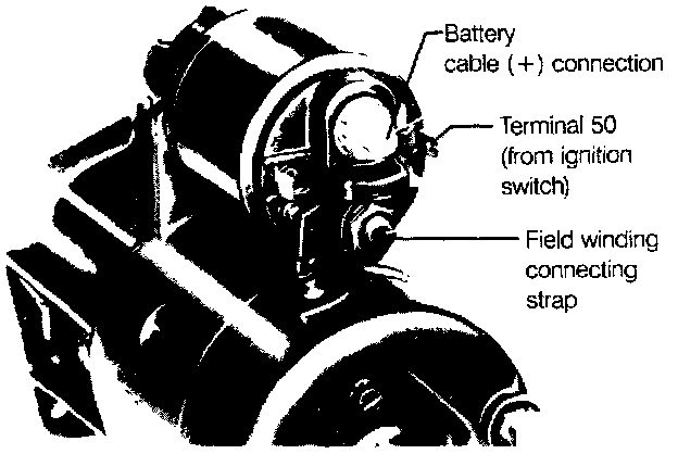 A defective starter solenoid may be replaced separately. To remove the starter solenoid, remove the starter motor as described in "Starter Motor Removal and Installation".1. Remove nut from the field winding connection strap, and remove the strap from the solenoid.