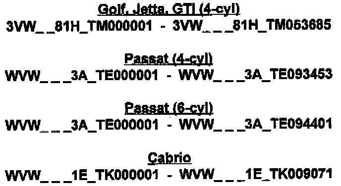 We wish to inform you of a service action program involving 1996 model Golf, Jetta and GTI 4-cyl, Passat 4 and 6-cyl and Cabrio vehicles. The affected vehicles are within the vehicle identification number range as shown.