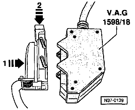 - Install VAG 1598/18 test box onto multi-pin connector -1- and lock, in direction of (arrow -2-).