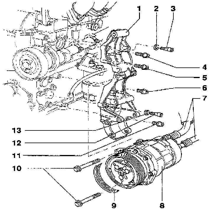 Compressor bracket, removing/installingNOTE:Compressor and related parts can be removed and installed without having to open refrigerant system