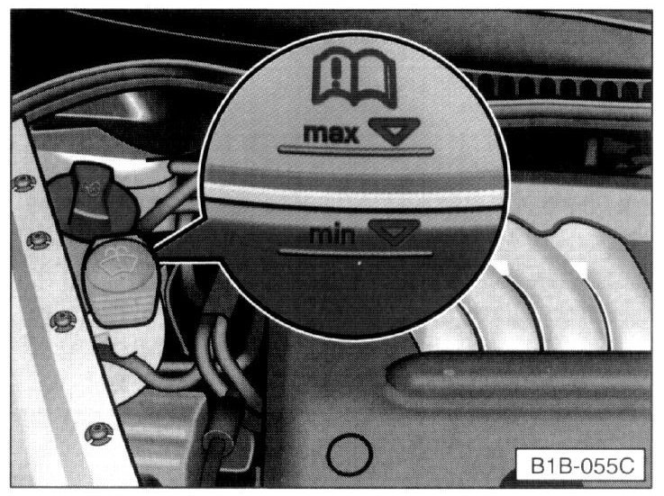 The coolant level must be between the reference lines when the engine is cold and can be slightly above the upper line if the engine is warm.