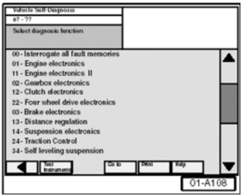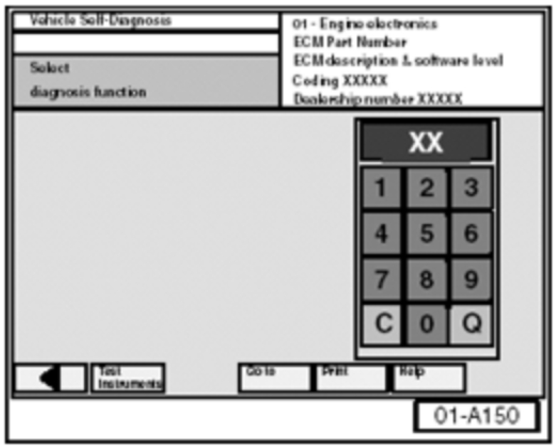 - Select vehicle system "01 - Engine electronics". Select Diagnosis Function "04 - Basic settings".