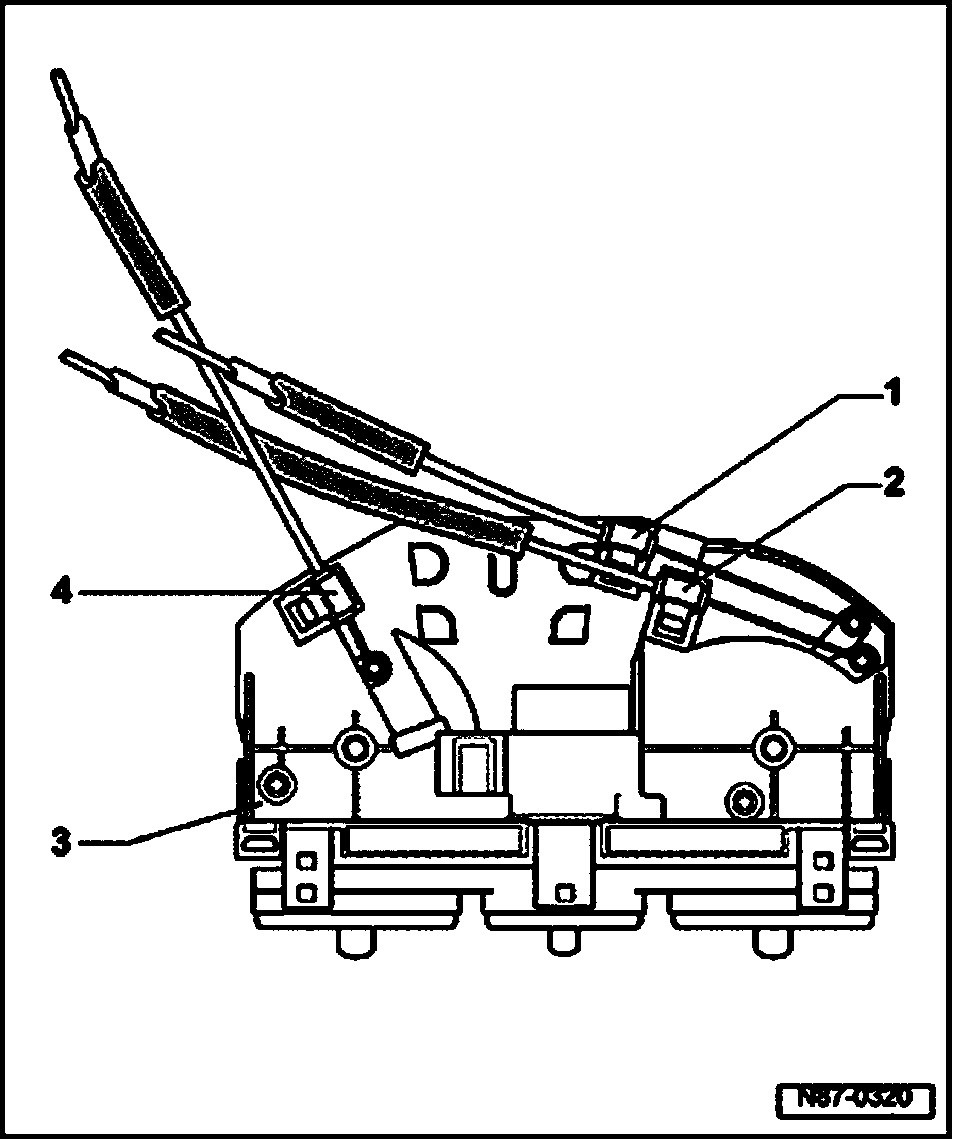 - Push central flap lever to stop -arrow A- and attach outer cable -2- with clip -3-.