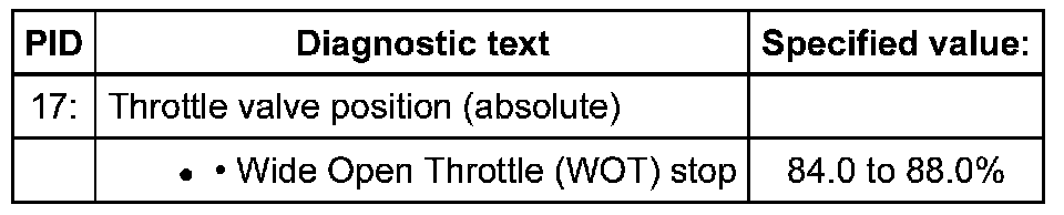 - Check specified value of throttle valve position (absolute) at Wide Open Throttle (WOT) stop: