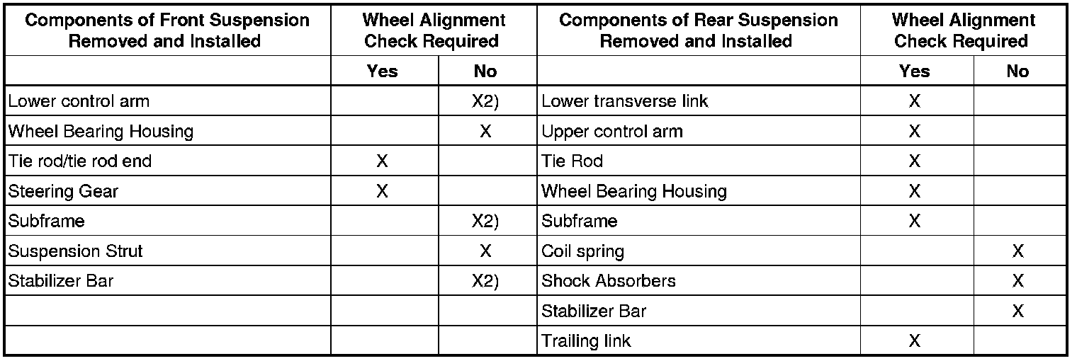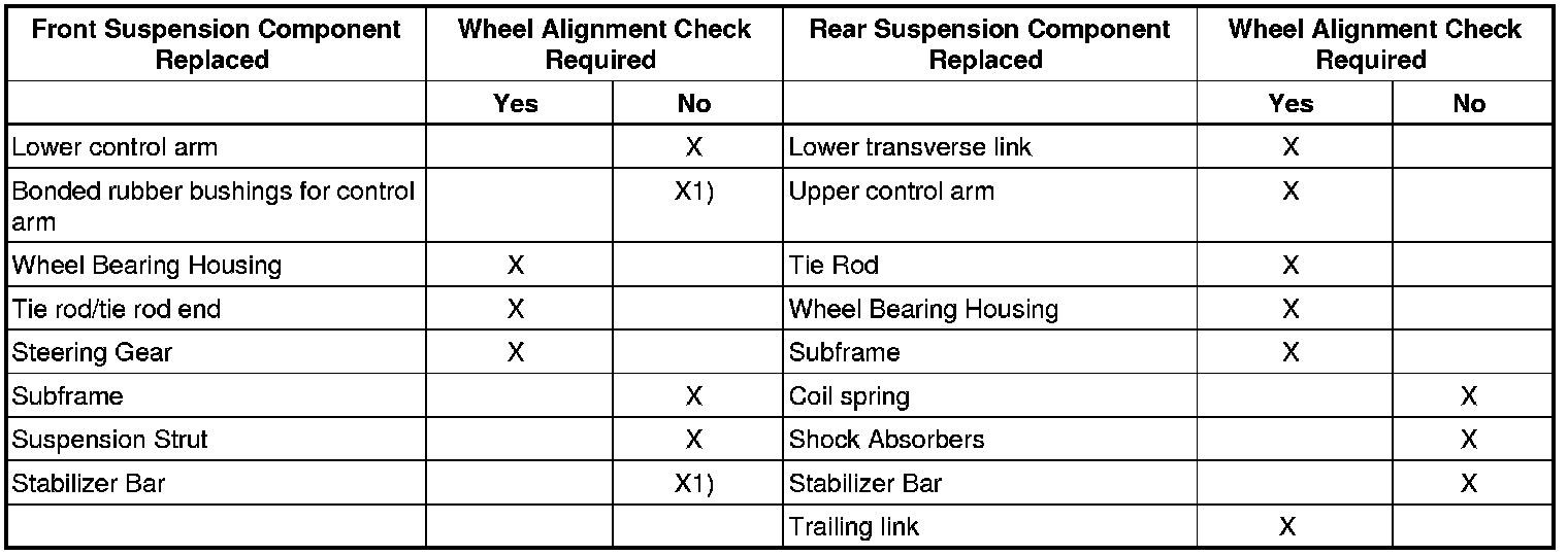 • Wheels should not be aligned until the vehicle has been driven 1,000 to 2,000 km, since it takes this long for the coil springs to settle.