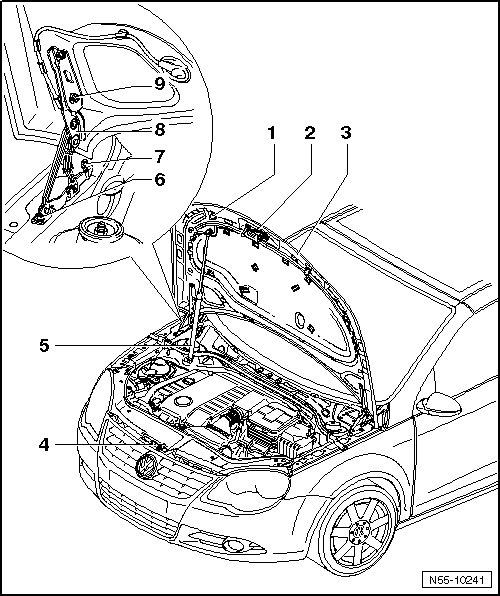 - Remove gas-filled strut - 5 - from the hood - 3 -. Refer to => [ Gas Strut ] Gas Strut