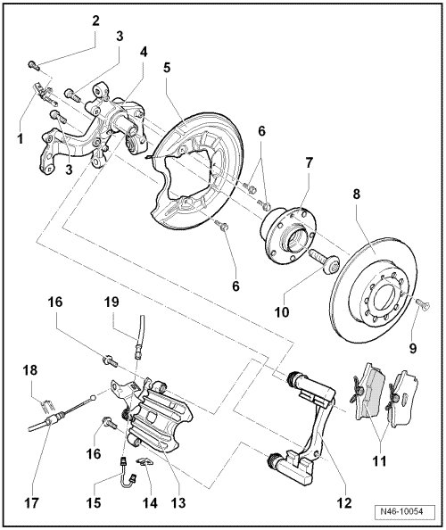 • Before removing brake caliper or disconnecting brake hose, brake pedal actuator (V.A.G 1869/2) must be inserted (this dissipates pressure).