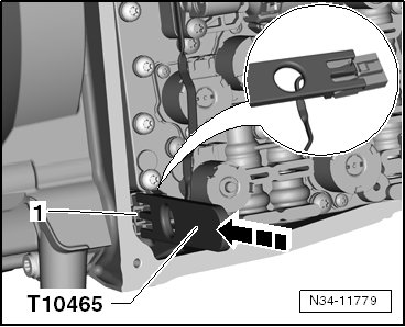 - Disconnect the connector - 1 - from the transmission input speed sensor (G182) and clutch oil temperature sensor (G509) using the release tool (T10465).