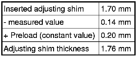 The specified bearing preload is reached when the determined measured value (0.14 mm) is subtracted from the inserted adjustment shim (1.70 mm).