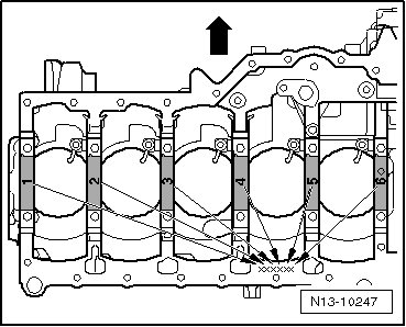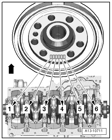The allocation of the bearing shells for the bearing cap is identified by a series of letters on the vibration damper. The first letter in the row of letters represents bearing "1", the second letter is for bearing "2", etc.
