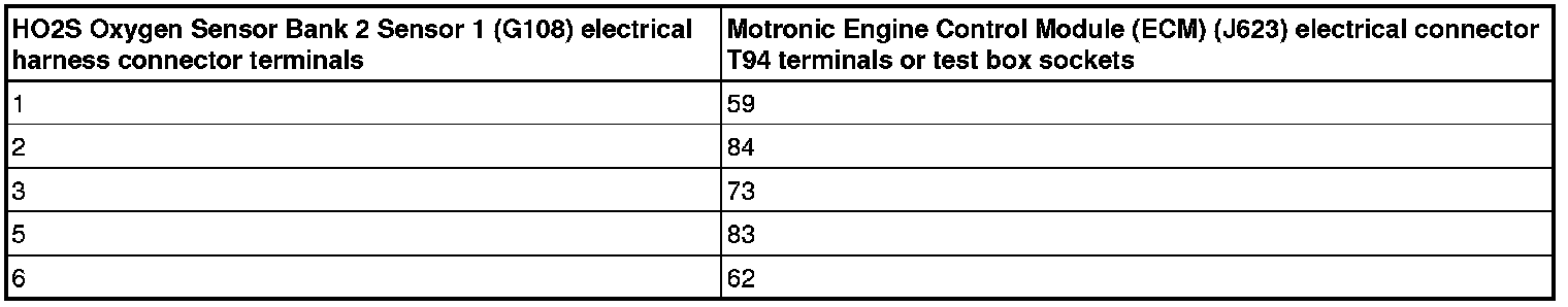- Using a multimeter, check the HO2S Oxygen Sensor Bank 2 Sensor 1 (G108) electrical harness connector terminals to the Motronic Engine Control Module (ECM) (J220) electrical harness connector T94 terminals for an open circuit.