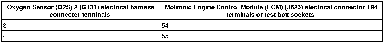 - Using a multimeter, check the HO2S Oxygen Sensor Bank 2 Sensor 2 (G131) electrical harness connector terminals to the Motronic Engine Control Module (ECM) (J220) electrical harness connector T94 terminals for an open circuit.
