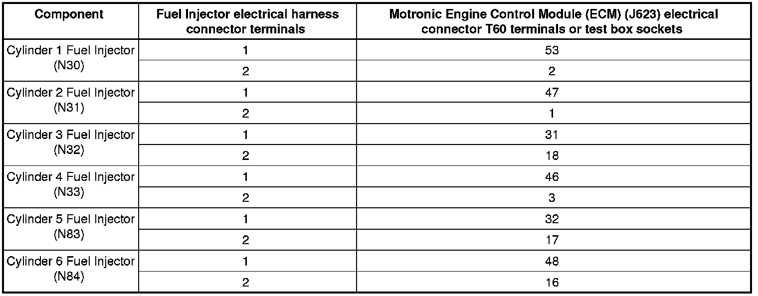 - Using a multimeter, check the fuel injector electrical harness connector terminals to the Motronic Engine Control Module (ECM) (J220) electrical harness connector T60 terminals for an open circuit.