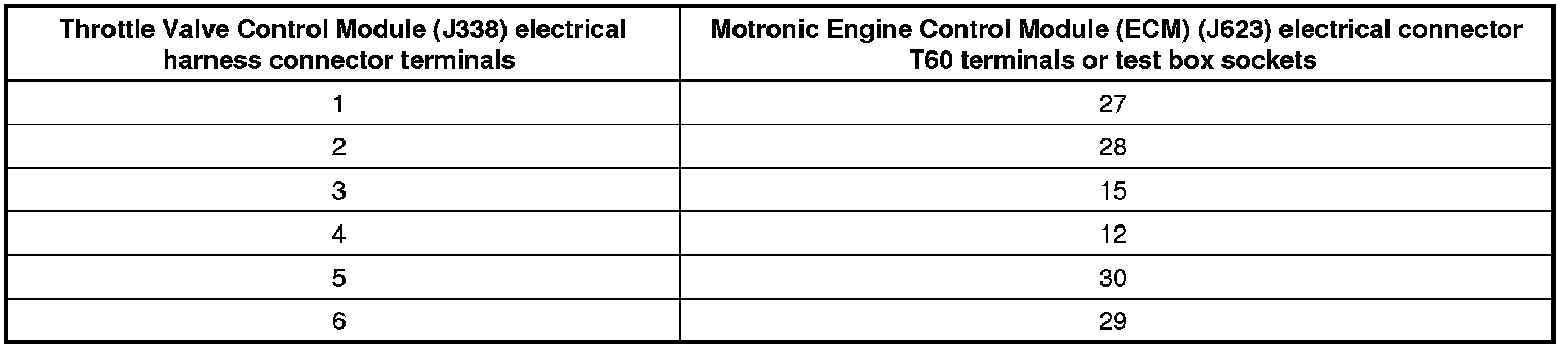 - Using a multimeter, check the Throttle Drive (for Electronic Power Control (EPC)) (G186) at Throttle Valve Control Module (J338) electrical harness connector terminals to the Motronic Engine Control Module (ECM) (J623) electrical harness connector T60 terminals for an open circuit.