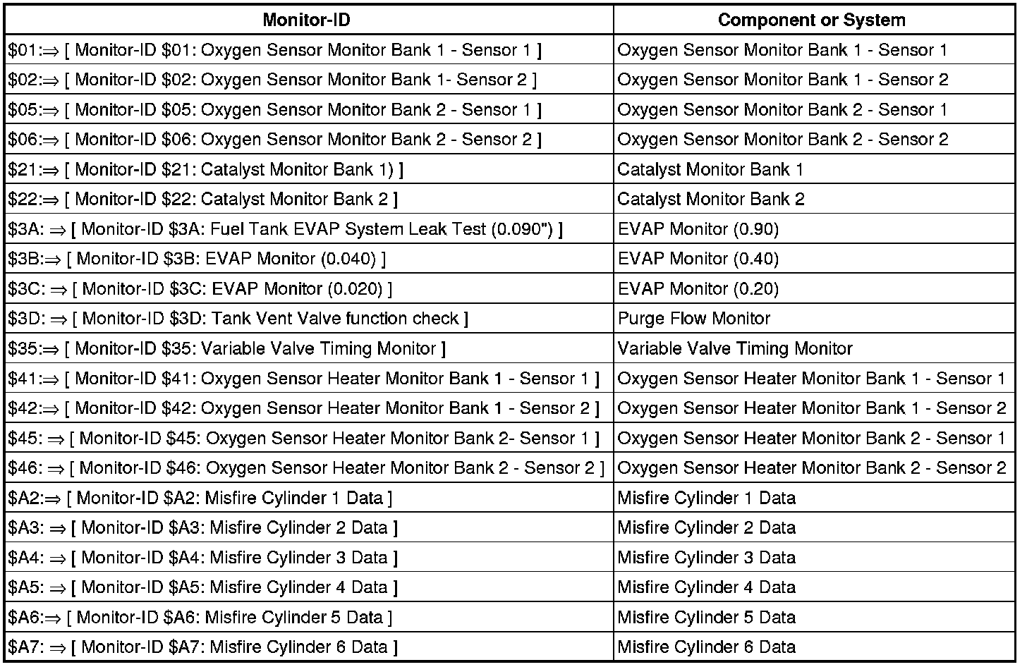 • Depending on the scan tool and protocol used, the information displayed in diagnostic mode 06 may be referred to by different names such as Test-ID, Hex-ID, Component-ID (CID), or On-Board Diagnostic Monitor Identifier (OBDMID).