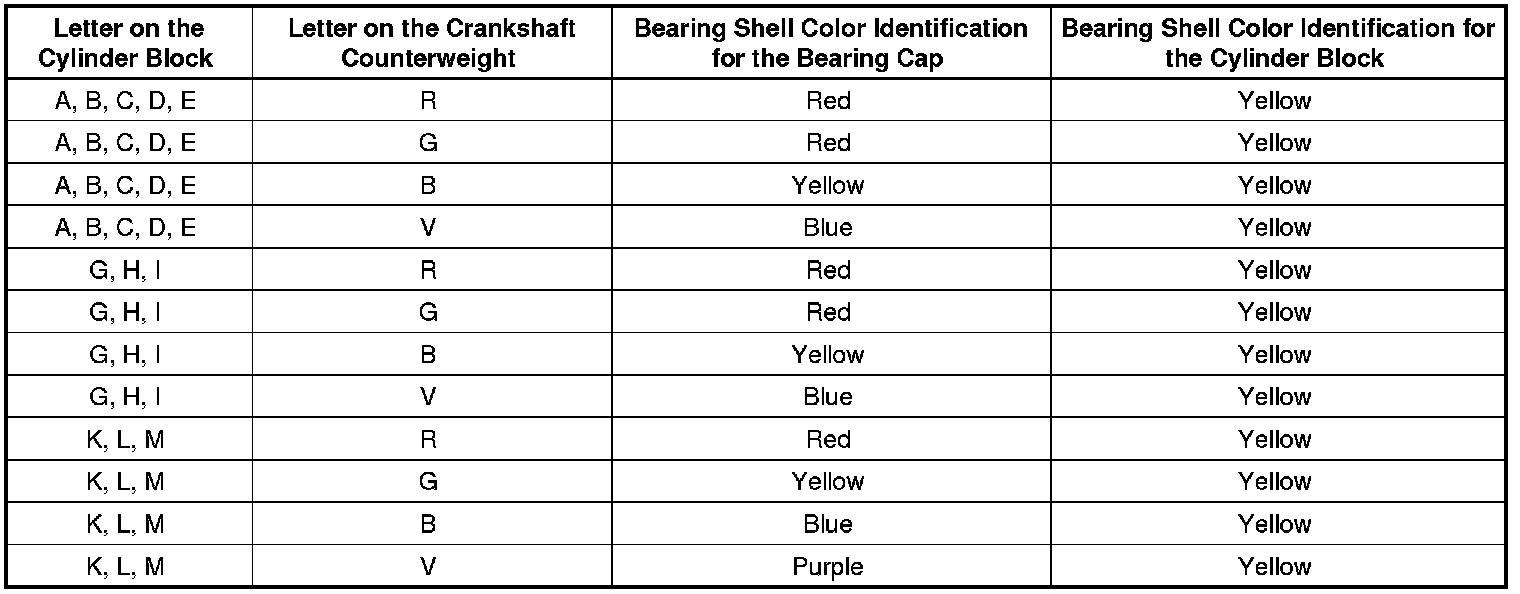 Using the letters on the cylinder block and crankshaft, determine the correct color identification for the bearing shell in the bearing cap (lower bearing shell)