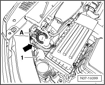 - Remove the windshield washer system filler neck - 1 - from the bracket - A - and secure it behind the headlamp.