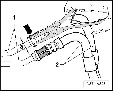 - Open the clip a maximum of 16 mm - a - and remove the lines - 2 - from the cooler - 1 -.