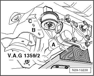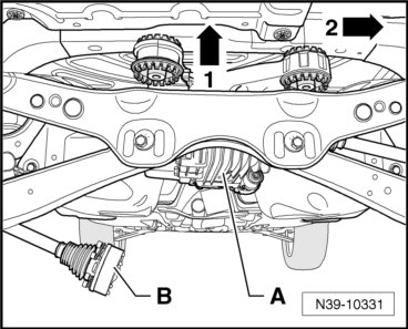 - Remove the left drive axle - B - from the flange and carefully lower it.