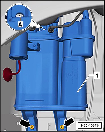 - Loosen both nuts - arrows - and remove the Evaporative Emission (EVAP) canister - 2 - downward from the bracket.