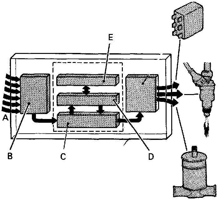 - Compares air input and engine speed input to information stored in memory