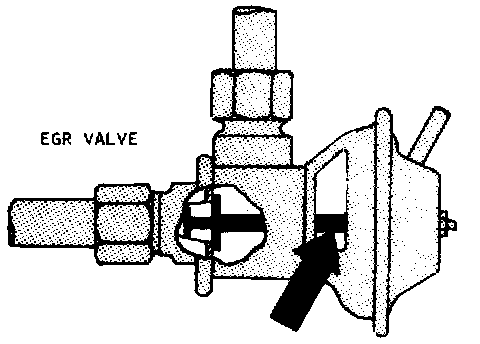 The EGR valve operates on a vacuum signal from the throttle plate. With the engine idling, the valve must be closed (check by observing the rod movement through the observation window in the valve housing, Fig. 14). If the valve is open at idle, rough idle will result. Adjust the throttle stop screw to position the throttle butterfly so that the valve will be closed at idle. This can be checked by connecting a vacuum gauge to the vacuum line from the intake manifold to the EGR valve. With the throttle plate properly adjusted, there should be no vacuum gauge reading at idle.