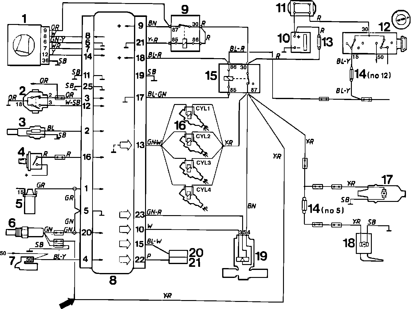 The PTC-resistor in the lambda sensor (6) is connected to the electrical system by two wires. One to ground and one to fuel pump relay terminal 87 (voltage supply), as illustrated.