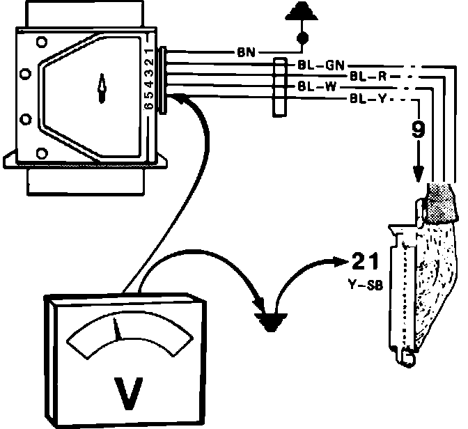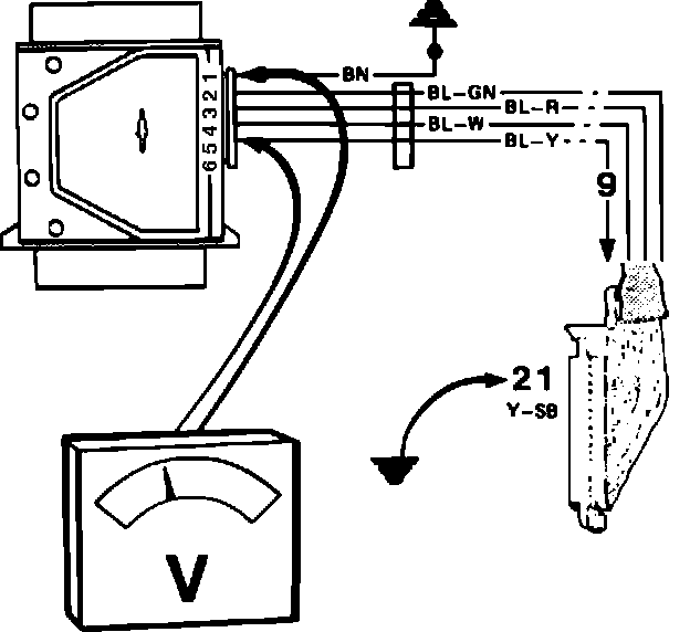 10. Connect voltmeter between mass air flow sensor connection #1 (ground) and #5 (current feed from system relay).