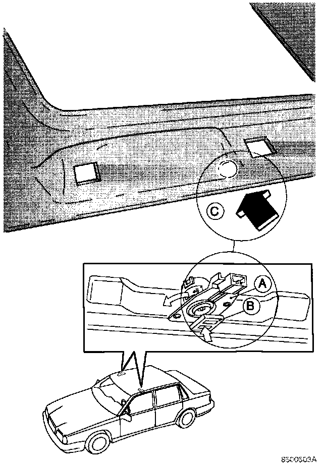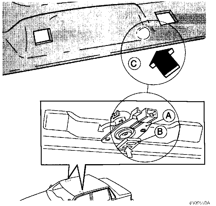 Replacement headliners will no longer have an opening for the ECC in-car temperature sensor (A). Therefore, on vehicles with ECC, openings (C) must be made in the headliner for the left and right side sensors.