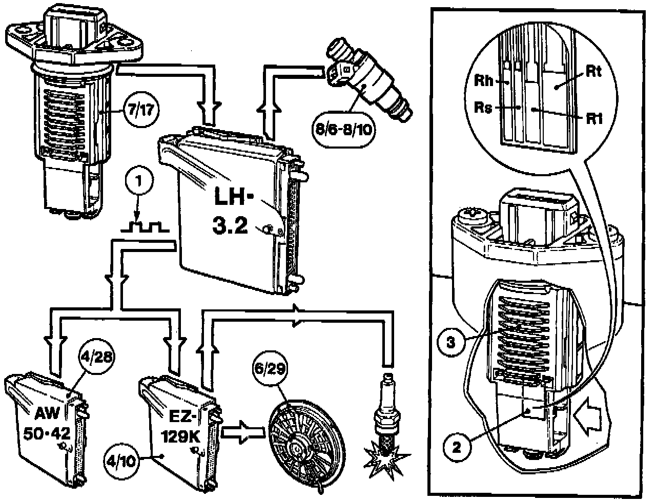 ^ Rs is a flow-sensitive resistance of the PTC type. Its purpose is to supply signals indicating the cooling effect of the intake air.