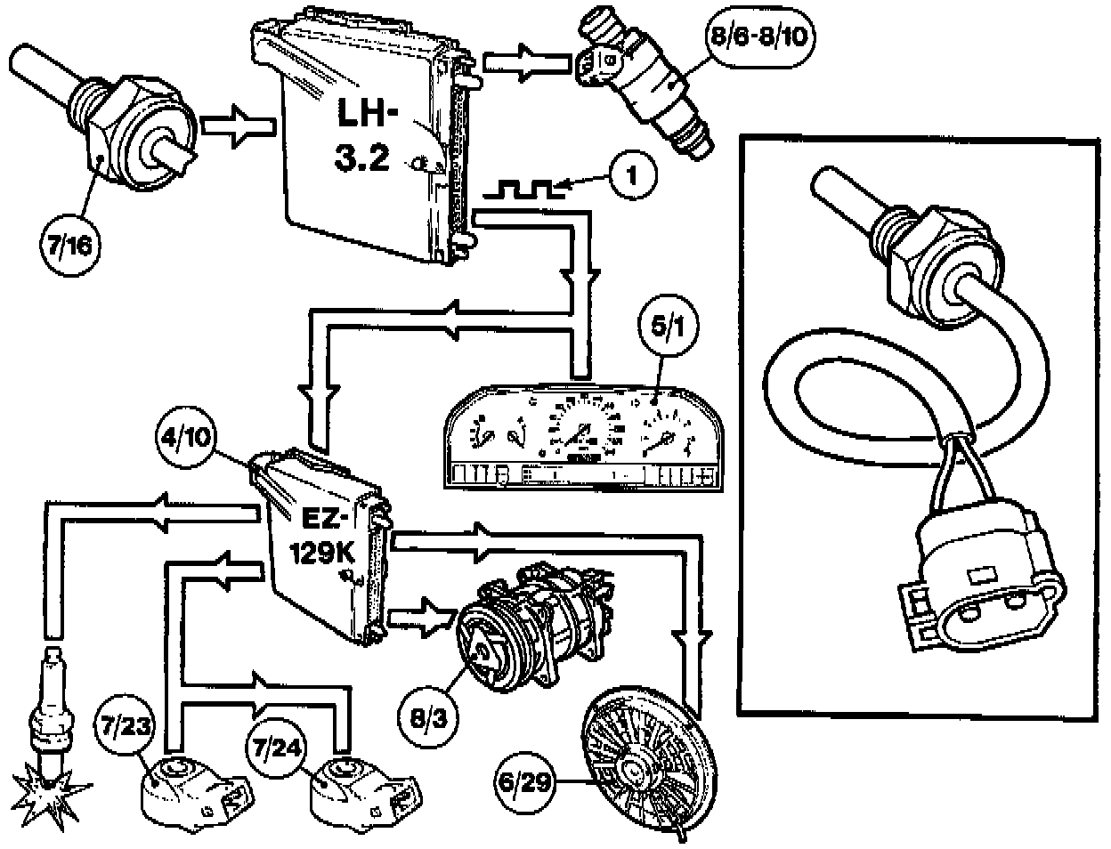 The Engine Coolant Temperature (ECT) sensor (7/16) is common to the MFI system, DI (distributor ignition) system and combined instrument panel. The signal is used by: