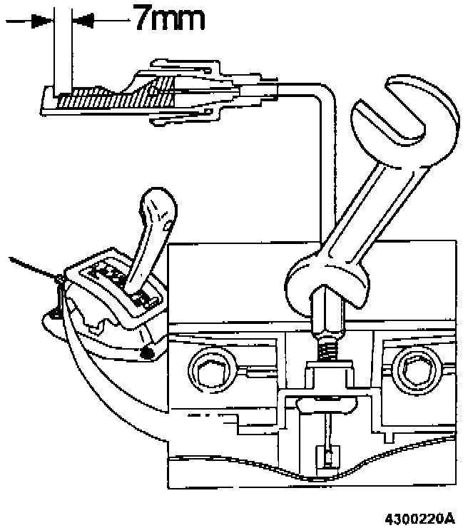 Adjust cable at gear lever end until clearance between locking tabs at ignition switch end is approx. 7 mm (0.27 in.) (as illustrated).