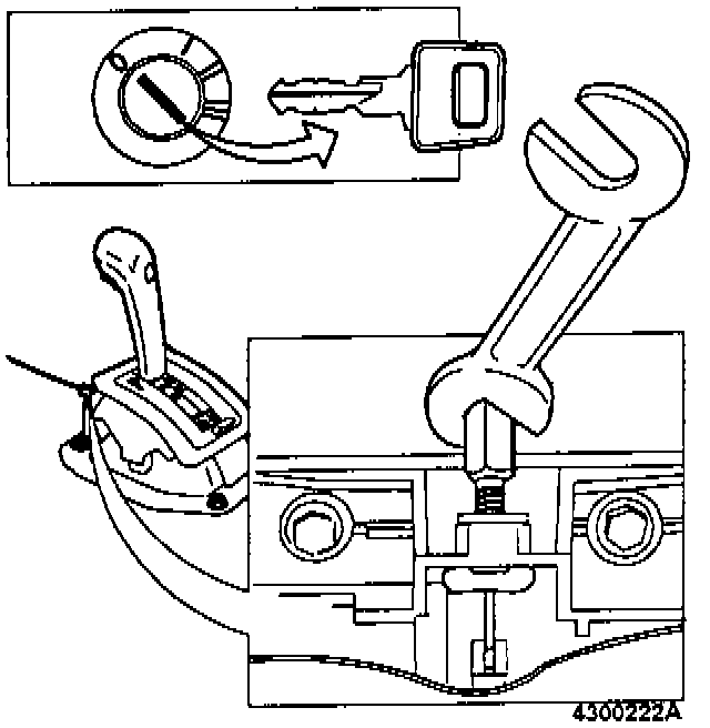 Return lever to position P and remove ignition key. Press override button. It should now be impossible to move lever from position P. Override function should operate only when ignition key is in position I or II.
