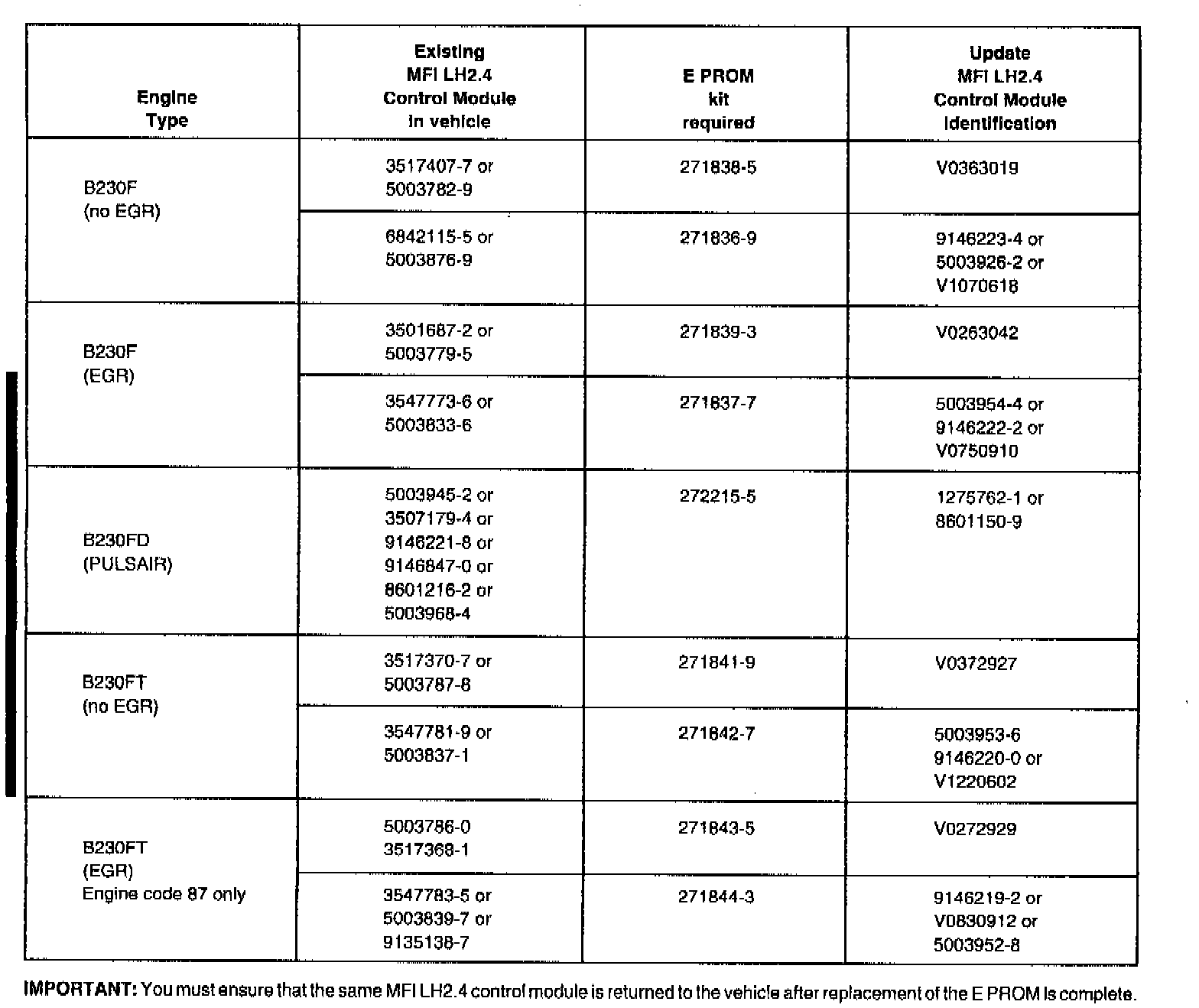 Inspect the MFI control module in the vehicle to verify the correct E PROM required. The best way to find out if a car has been already updated is to check the label on the LH MFI control module in the car against the chart above. If the label has either the program code (Vxxxxxxx) AND/OR the part number indicated under the "updated MFI LH2.4 Control Module Identification" column, the car has the latest programming.