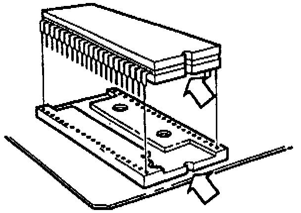 Carefully locate the E PROM and press it down with the inserter tool without pressing the button. Remove the tool. Check that all pins are in their proper location.