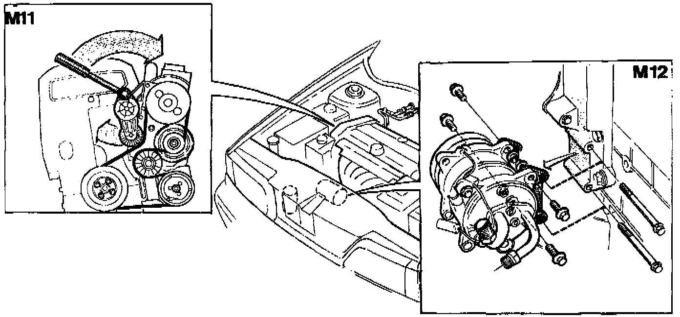 - Switch brackets and pipe connection (flange) to the new compressor. Torque settings: brackets 40 Nm (30 ft.lb.), pipe connection 24 Nm (18 ft.lb.).