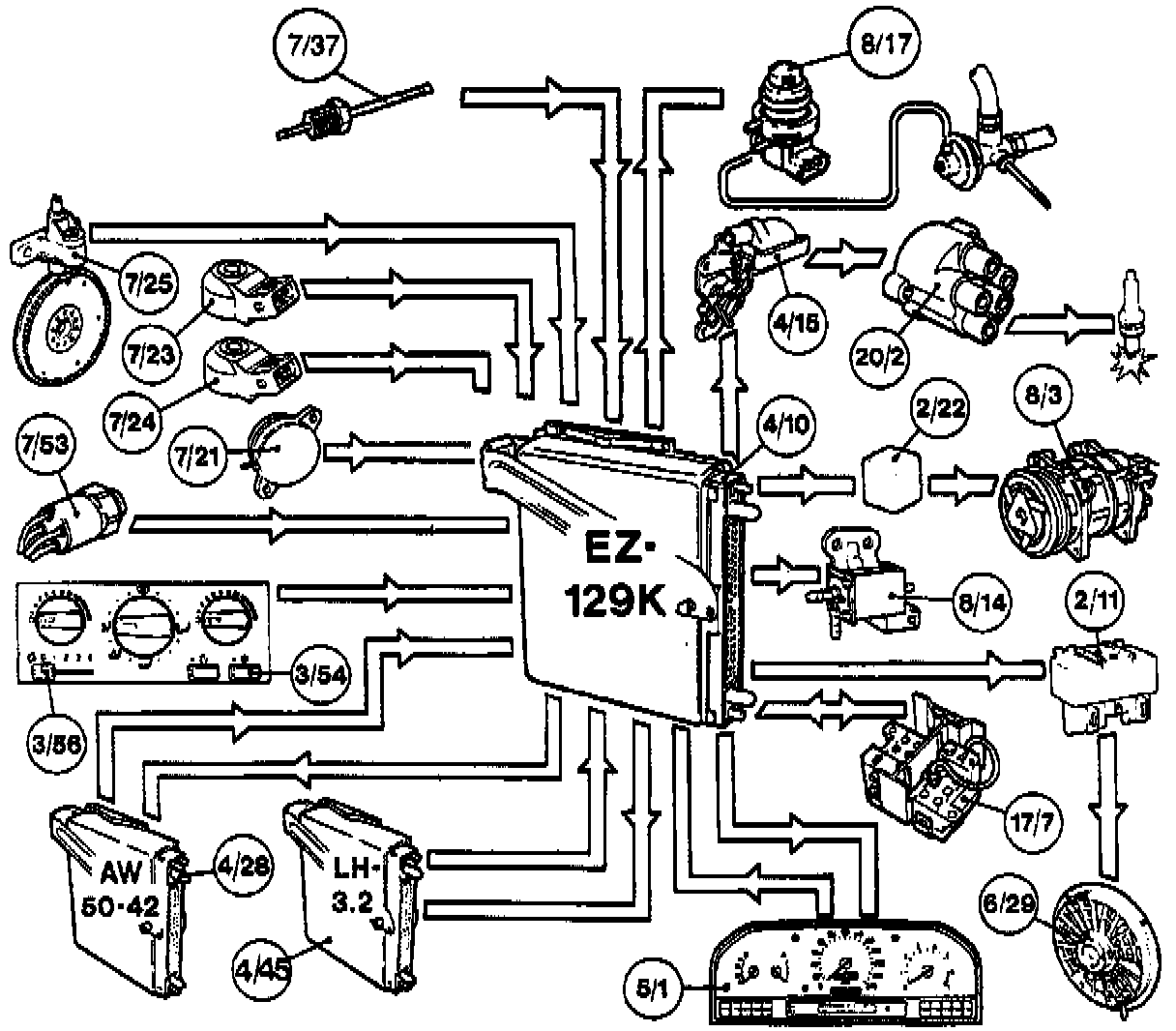 ^ a circuit which operates the engine cooling fan (6/29) through the fan relay (2/11). For this purpose, the ICM is connected to a high-pressure switch (7/53) on models with air conditioning;