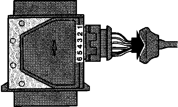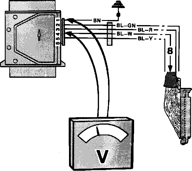 6. Check air mass meter by connecting an ohmmeter between ECU connector pins 6 and 7.