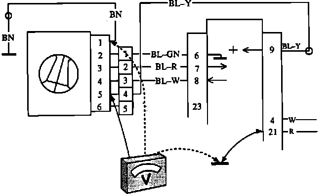 8. Connect a lead between ground and ECU connector pin 21. The relay should now close and the voltmeter should show: