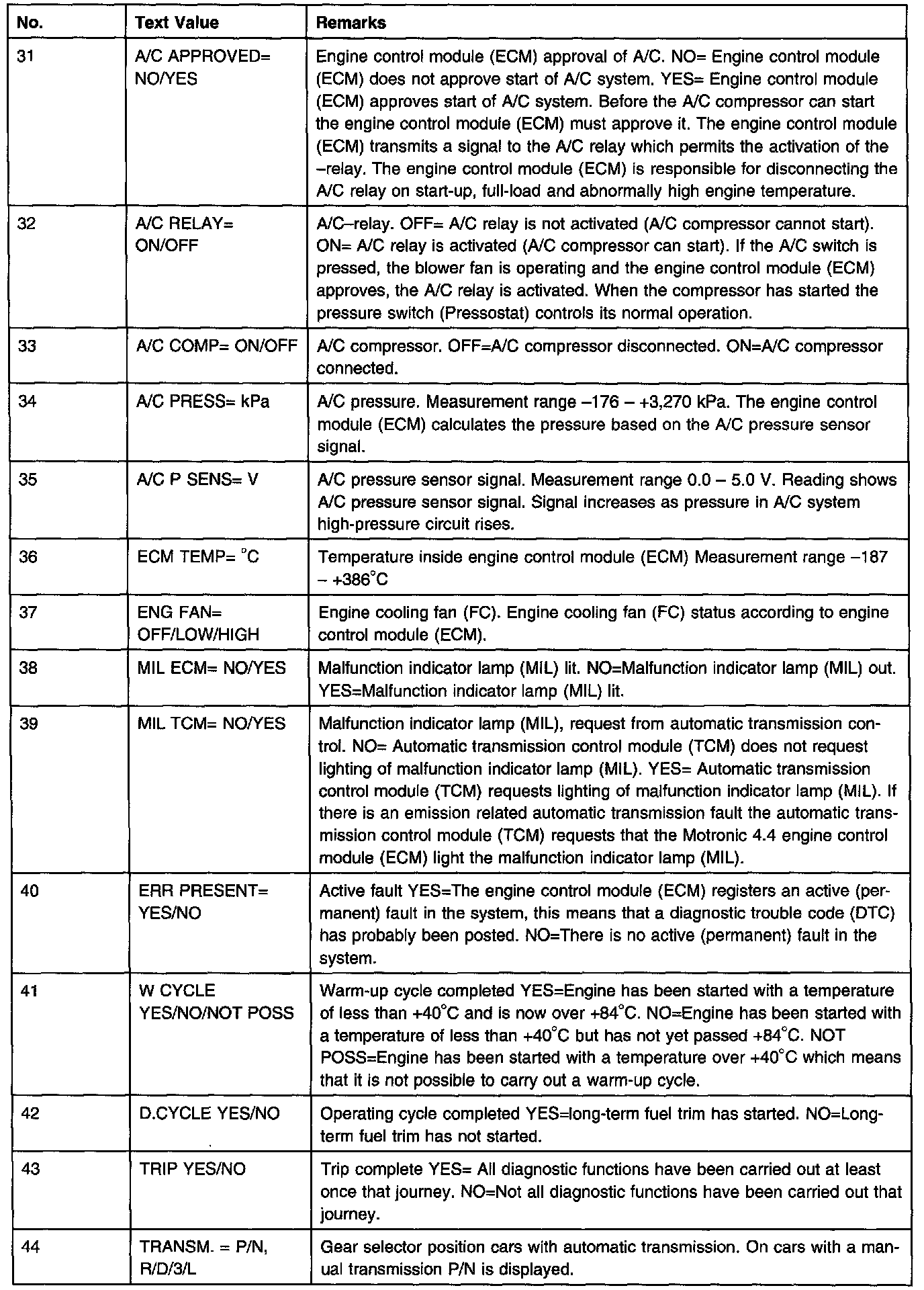 Some values are different to those given in Signal Description. This is because Scan Tool (ST) values are calculated and filtered by the control module. In certain cases the engine must be running to obtain the relevant values.