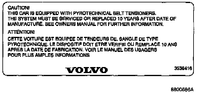 The SRS decal on the B-post shows that the pyrotechnical seat belt tensioner must be inspected or replaced 10 years after its date of manufacture.