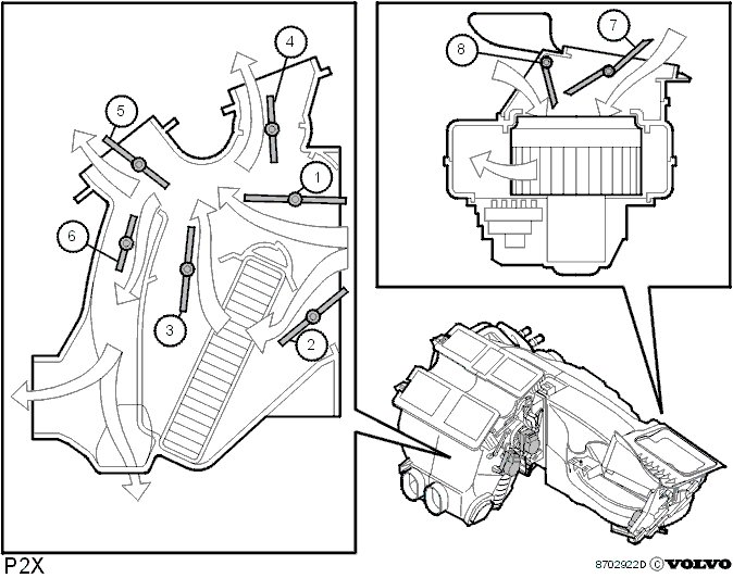 - Six temperature shutter for mixing hot and cold air. Three on the lefty and three in the right hand sides. On each side there is one shutter installed (2) upstream and one downstream (3) of the heater element. (1) and (2) together control the amount of air to be heated and (3) guides the hot air to the correct air vent.